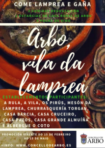 Über mehrere Tage kann man hier Köstlichkeiten mit Neunauge probieren. Dazu wird auf den Straßen viel Dudelsack gespielt und die örtliche Musikkapelle gibt sich ein Stelldichein. Das Neuauge ist ein zylinderförmiger Fisch ohne Schuppen, der sich in Flüssen vermehrt, dann im Meer aufwächst und später erneut in den Fluss zurückkehrt. In dieser Region wird er vor allem zwischen Januar und April gefischt, und zwar mit den traditionellen „pesqueiras“ aus Stein, die zum Fangen in den Fluss gehängt werden. Zu den leckeren Fischgerichten gehört in der Regel ein Wein aus der Region.